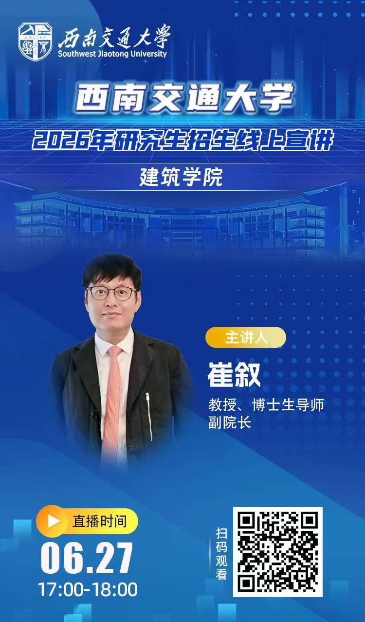研究生培养特色、学科优势及招生政策,学院将于2025年6月27日(明日)下午17 :00-18 :00举办研究生招生线上宣讲会。本次宣讲会特邀学院副院长、博士生导师崔叙教授作为主讲嘉宾。崔叙 教授将立足学院发展前沿,解读2026年研究生招生专业方向、培养体系、师资力量、科研平台及最新招生政策。本次宣讲采用线上直播形式,打破地域限制,诚邀全国各地对建筑、城乡规划、风景园林、美术与书法等及相关领域深造的学子积极参与。欢迎扫码进入直播间,获取第一手招生资讯,为您的升学之路明晰方向!期待明日线上与您相会,共绘学术蓝图!
