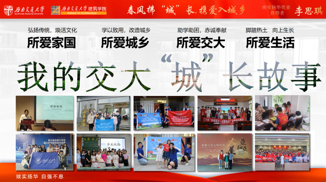 以满心热爱诠释青春担当,如一缕春风将爱带入城乡,将实践力行深入到爱家国、爱城乡、爱交大、爱生活的方方面面。李思琪的交大“城”长故事里,有弘扬传统,焕活文化;有学以致用,改造城乡;有助学助困,赤诚奉献;有脚踏热土,向上生长……