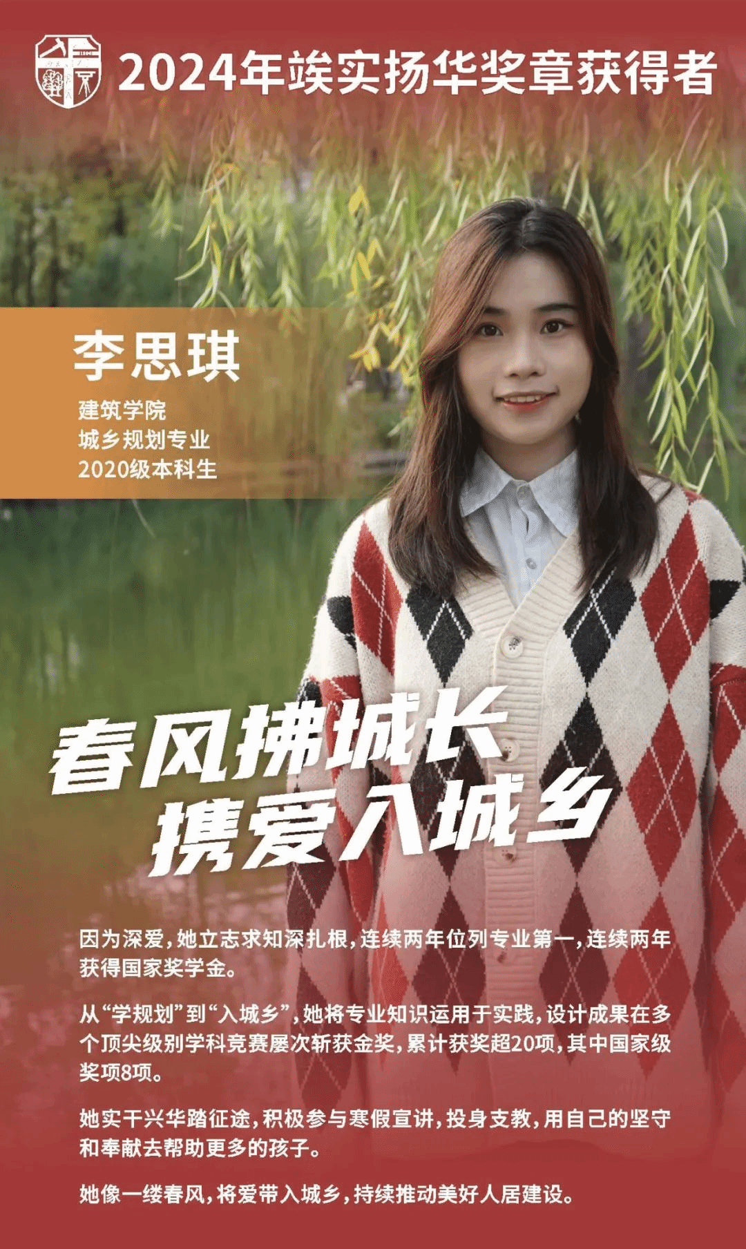 ,出于对空间设计的热爱,她选择了在建规领域的老四校继续深造。最后她说,“笔绘生活点彩墨,博采众长抒华章”。她会一直走在“以成长奔赴城长”的道路上,用规划结合实际,用脚步丈量城乡。她不从纸上逞空谈,而是像一缕春风将爱带入城乡。她选择自己热爱且美好的一切,在竞赛场上感受成长,在青春旅途结交益友,在华丽舞台绽放光彩,在成长中奔赴“城”长,立志以己所学惠民生。