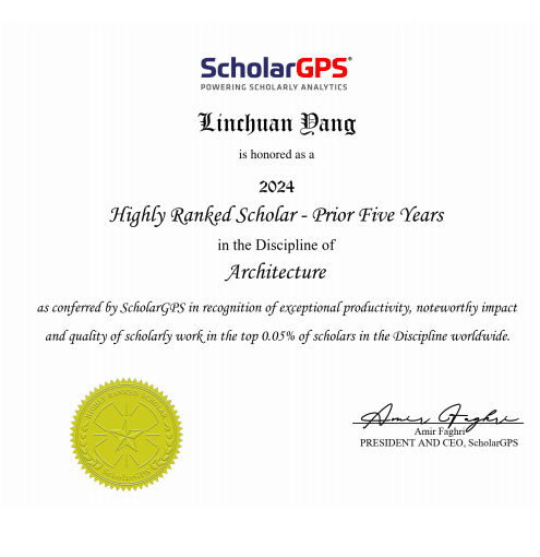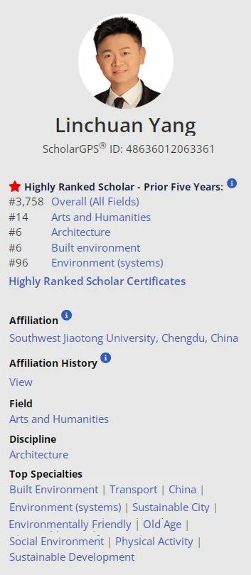 杨林川教授成功入选全球前0.05%顶尖学者近五年榜单,在建筑学科(Discipline: Architecture)和建成环境专业(Specialty: Built Environment)两个榜单中均排位全球第六。