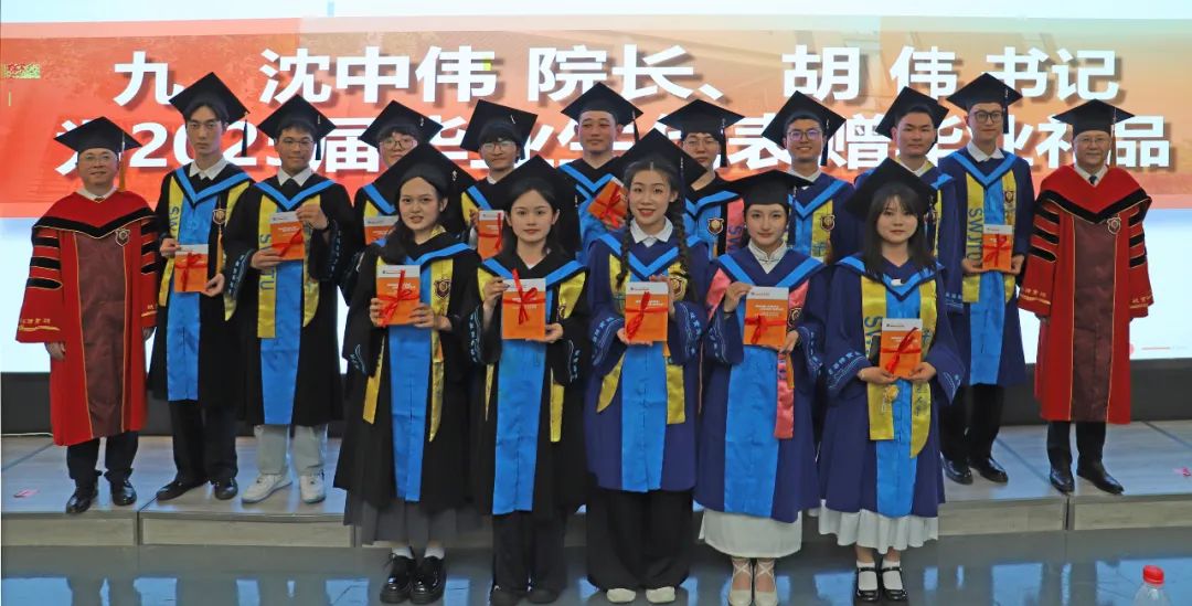 典礼尾声,院长沈中伟和党委书记胡伟代表学院向毕业生们赠送了毕业礼品。小小的礼品承载着学院深深的祝福与美好期许,愿学子们未来一帆风顺、前程似锦。