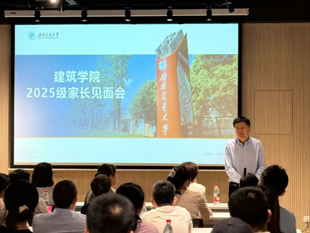 于9月5日14时30在西南交通大学美术馆大厅召开了2025级本科新生家长会。院长沈中伟教授、刘一杰副书记、学生支持办公室主任刘野、学工组副组长团委书记田方舟,以及本科新生辅导员罗雨天与百余位家长面对面交流。