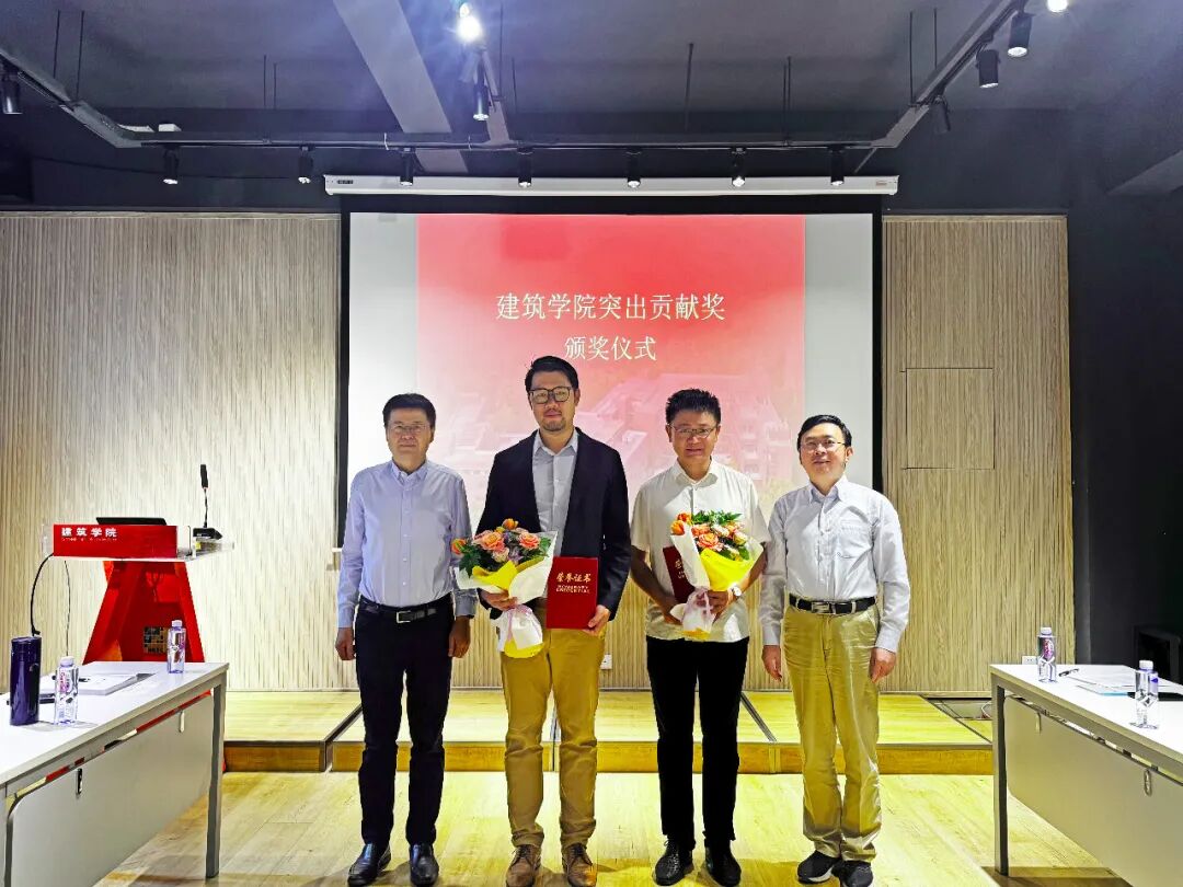 突出贡献奖”颁奖仪式。沈中伟院长与胡伟书记共同为获奖教师颁奖。宣湟老师凭借其在第六届青年教师讲课比赛及第五届全国高校教师教学创新大赛中的卓越表现,荣获两项一等奖,成为“双赛冠军”;杨林川老师则因其作为建筑学科全球顶尖学者及四川省青年五四奖章获得者的杰出表现,受到表彰。两位获奖教师的突出贡献,不仅提升了学院的教学科研水平,更为全体教师树立了榜样。