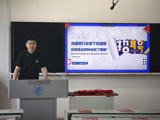 于2025年5月8日下午,在八号教学楼8535教室举办了“当建筑行业按下加速键,你的就业时钟调到了哪里”就业指导讲座。本次宣讲邀请了基准方中建筑设计有限公司人力资源部助理主任傅捷以及基准方中建筑设计有限公司的2024届 漫蛙漫画