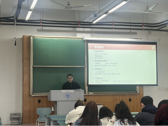 班会现场,王威老师依次对“安全教育与毕业相关事宜” 进行了分享与重点强调。在安全教育环节,王威老师聚焦于节假日安全、毕业季安全、求职安全、网络行为安全以及寝室生活用电安全等方面,以生动具体的警示案例,敲响安全的警钟,引发了同学们的深度关注与强烈共鸣。