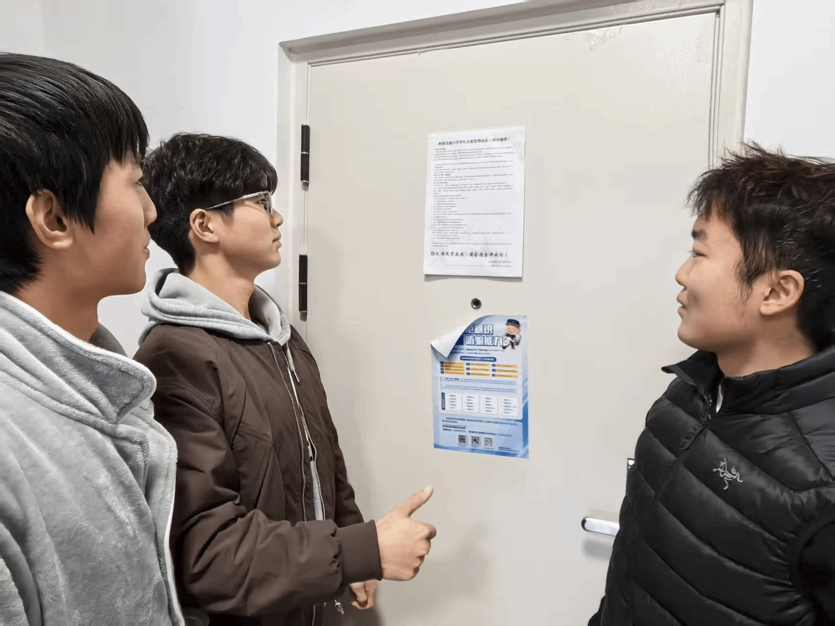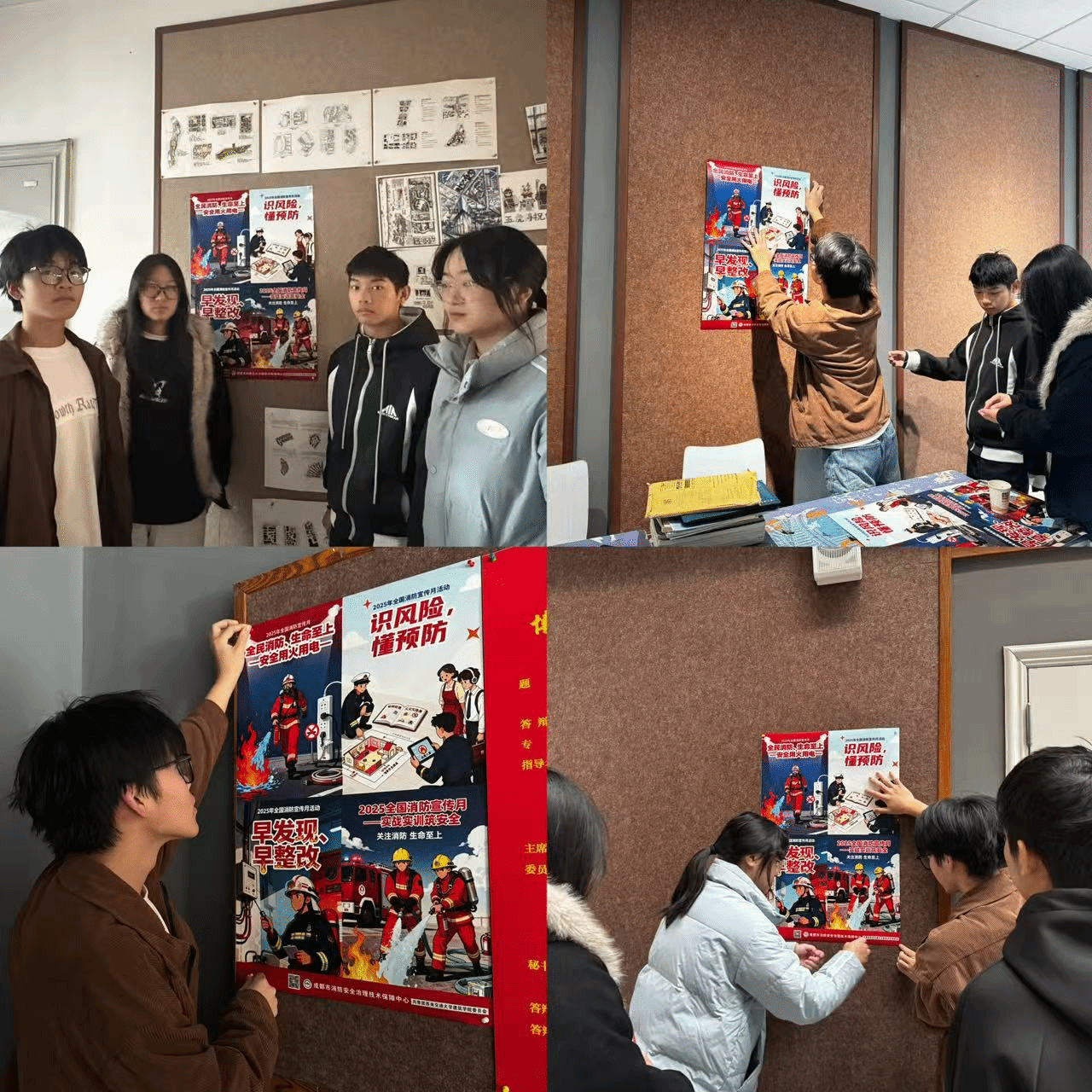 本次宣传活动中,学生园区自管会的同学们在八号教学楼逐层检查公共空间并张贴警示教育海报;同时,各年级辅导员老师们走进学生园区,向同学们进行宿舍防火用电安全教育,并和同学们一起张贴《 漫蛙漫画