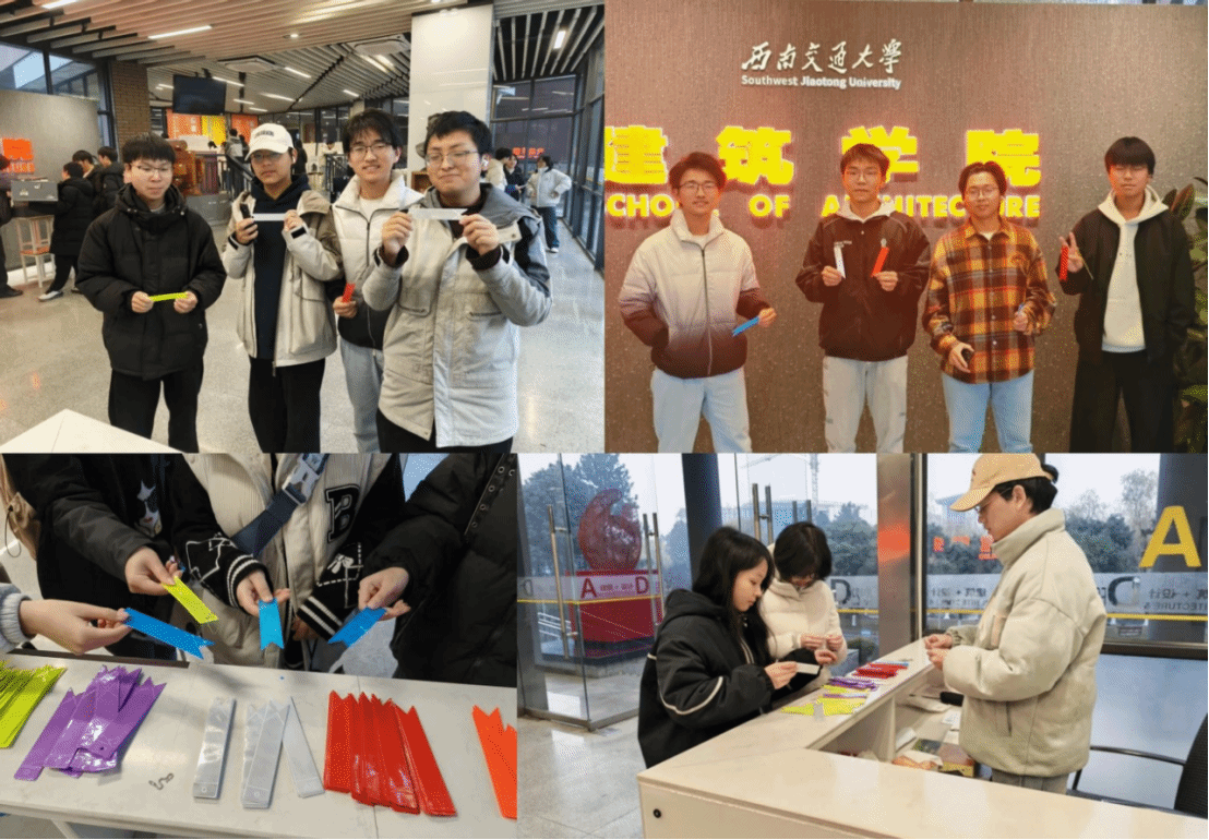 活动期间,八号教学楼的发放点前总是人头攒动。学生会的工作人员早早备好各色反光荧光条,耐心向同学们讲解反光条的使用方法——只需将其挂于衣物、书包等显眼位置,在暗光环境下便能形成醒目反光,让车辆驾驶员及时察觉行人踪迹。吸引同学们纷纷上前领取,不少备战期末的学子表示,学院的贴心举措让他们能更安心地投入到复习和绘图中,感受到了集体的温暖。