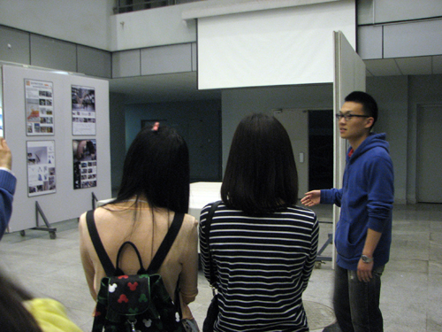 图书馆前的pvc管桌椅处,胡文韵同学就图书馆pvc家具系列的设计过程和表现形式为例进行了生动有趣的讲解,在场同学也现场一一体验了建造节模型内部空间,感受这种艺术气息和文化氛围,同时对 漫蛙漫画