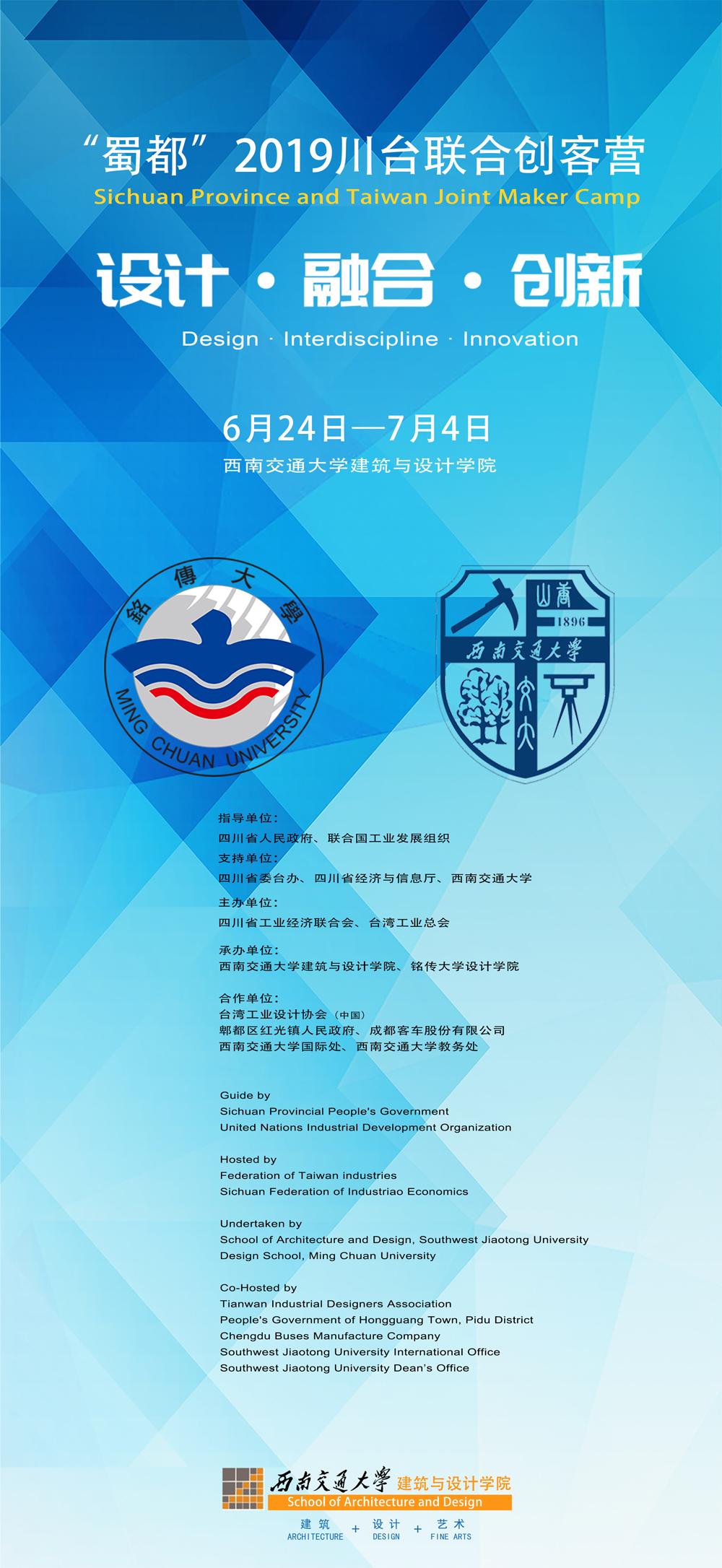 2019川台联合创客营活动是四川省人民政府和联合国工业发展组织指导,四川省委台办、四川省经济与信息厅、西南交通大学支持,由台湾工业总会、四川省工业经济联合会主办、西南交通大学建筑与设计学院、铭传大学设计学院承办,并由台湾工业设计协会(中国)、郫都区红光镇人民政府、成都客车股份有限公司、西南交通大学国际处、西南交通大学教务处协办的中国四川与中国台湾工业设计“产学研”教学与设计实践交流活动。