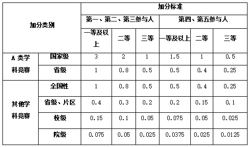 (5)集体参赛获奖时,如主办方要求必须以团队方式参赛时,团队比赛获奖等同于个人获奖;如果主办方未明确要求参赛方式的比赛获奖时,加分方法为以相应奖次应加分数除以总人数;