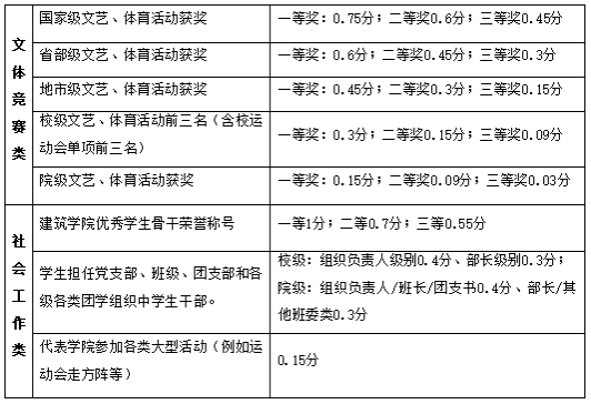 (1)文体竞赛及社会工作类有多项加分情况时,文体竞赛及社会工作类各计一项最高分;